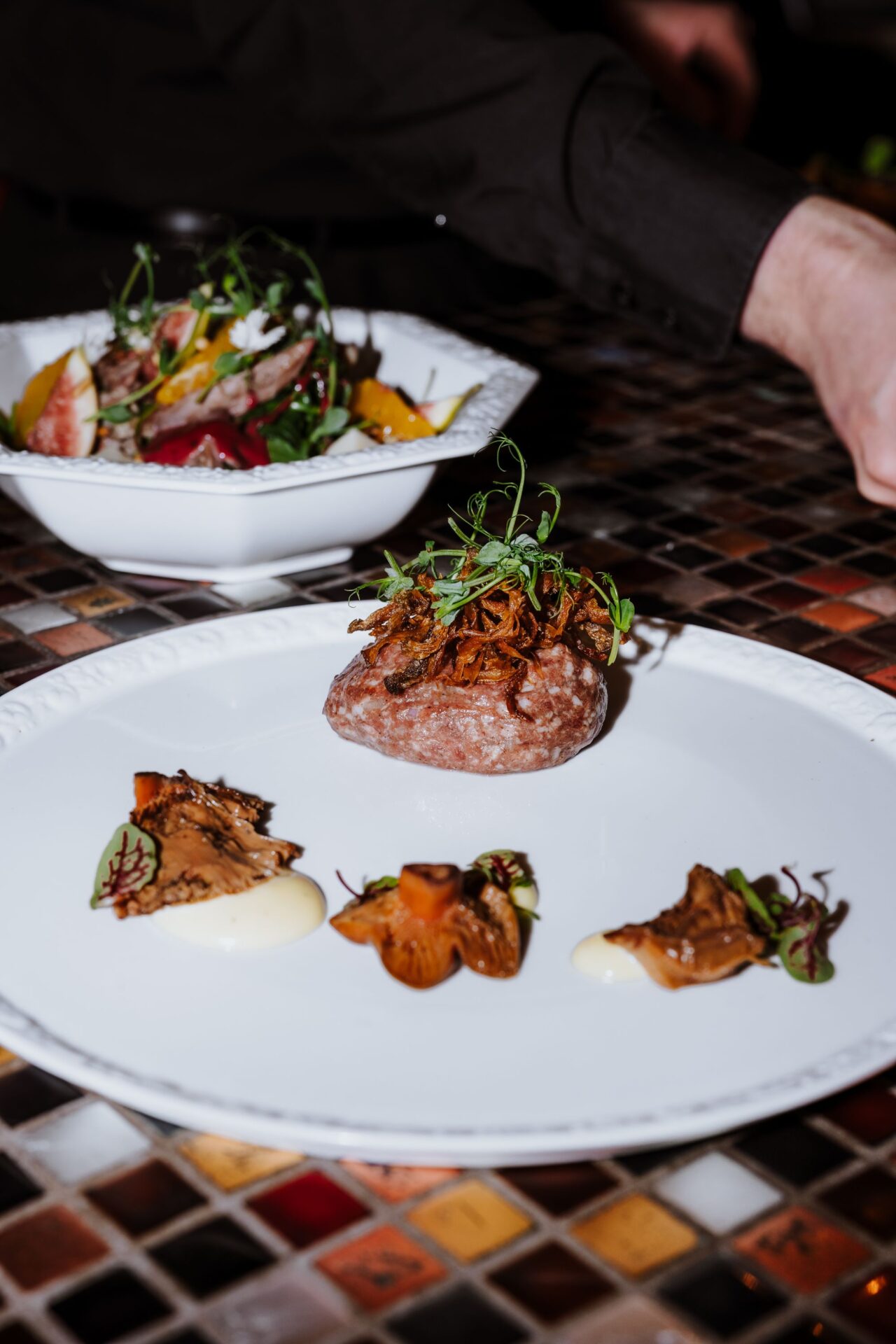 Tatar (100g) z majonezem truflowym z dodatkiem marynowanych rydzów i piklowanej cebulki, serwowana na grzance