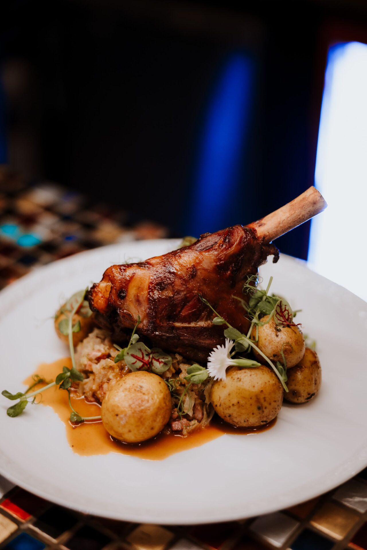 Gicz jagnięca (300g) Podana z purée z pieczonego selera oraz karmelizowanymi burakami i marchwią, polana gładkim sosem własnym