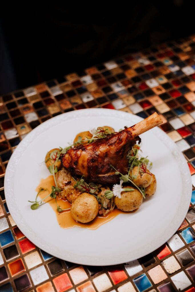 Noga z gęsi (200g) serwowana z burakami karmelizowanymi, krokietem ziemniaczanym i gładkim sosem winno-śliwkowym